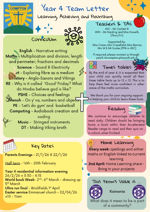 You can email us using the year 3/4 email address where a member of the year 4 team will respond to you as soon as possible: year3-4@compton.plymouth.sch.uk