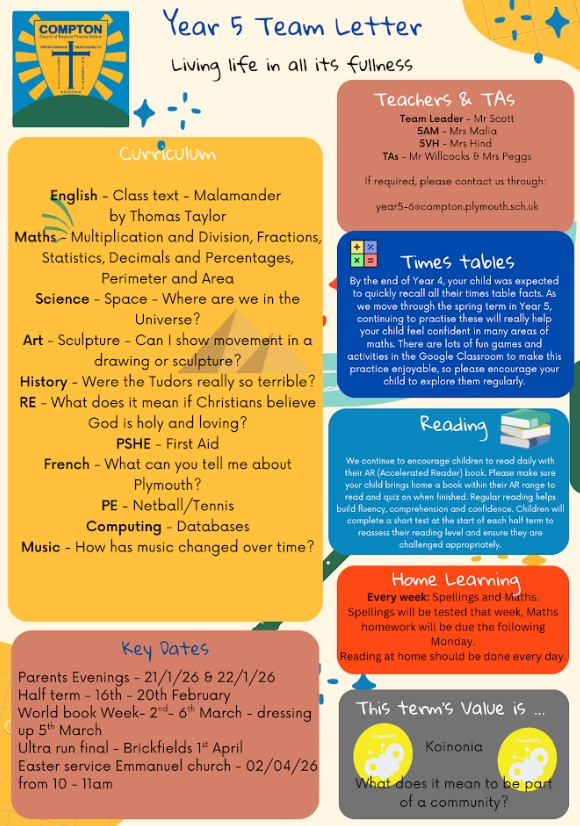 You can email us using the year 5/6 email address where a member of the year 5 team will respond to you as soon as possible: year5-6@compton.plymouth.sch.uk